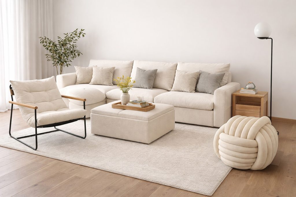 The White Briza Sectional Sofa with Ottoman anchors the space with generous seating and clean lines, making it ideal for both entertaining and everyday lounging. Complemented by the Heim White Elda Ottoman and the White Madison Accent Chair, the room feels cohesive yet visually interesting. The overall look is subtle, but confident—proof that softness can still make a statement.